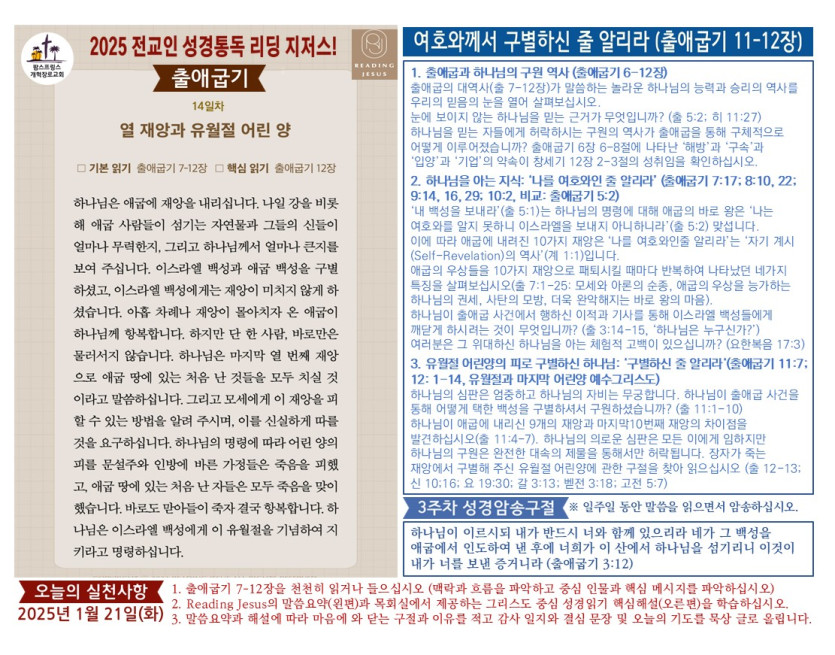 할렐루야! 2025년 전교인 성경통독 리딩지저스 제14일차 1월 21일(화) 말씀은 출애굽기 7-12장입니다.