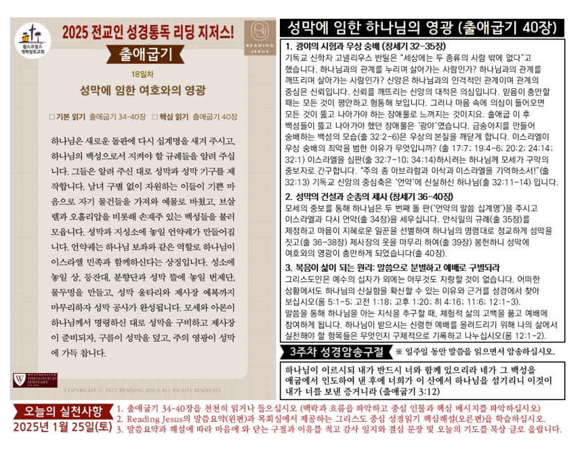 할렐루야! 2025년 전교인 성경통독 리딩지저스 제18일차 1월 25일(토) 말씀은 출애굽기 34-40장입니다.