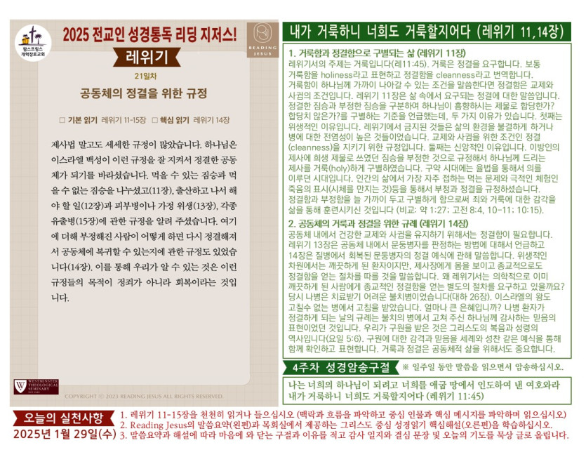 할렐루야! 2025년 전교인 성경통독 리딩지저스 제21일차 1월 29일(수) 말씀은 레위기 11-15장입니다.