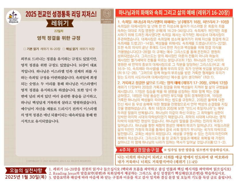 할렐루야! 2025년 전교인 성경통독 리딩지저스 제22일차 1월 30일(목) 말씀은 레위기 16-20장입니다.