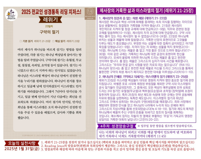 할렐루야! 2025년 전교인 성경통독 리딩지저스 제23일차 1월 31일(금) 말씀은 레위기 21-25장입니다.