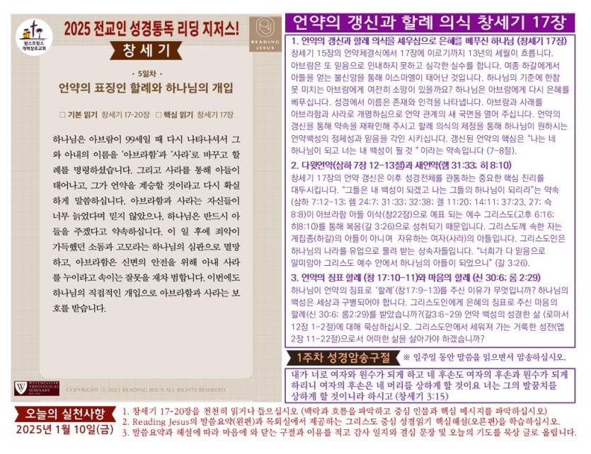 할렐루야! 2025년 전교인 성경통독 리딩지저스 제5일차 1월 10일(금) 말씀은 창세기 17-20장입니다.