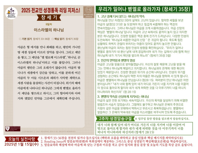 할렐루야! 2025년 전교인 성경통독 리딩지저스 제9일차 1월 15일(수) 말씀은 창세기 33-326입니다.