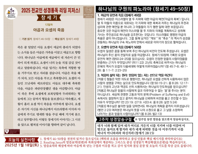 할렐루야! 2025년 전교인 성경통독 리딩지저스 제12일차 1월 18일(토) 말씀은 창세기 46-50장입니다.