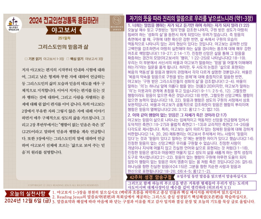 (2024년 12월 6일) 'Reading Jesus 응답하라' 말씀요약과 본문해설 (제251일차)