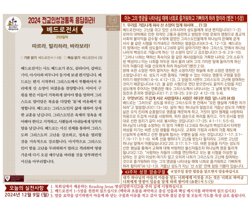 (2024년 12월 9일) 'Reading Jesus 응답하라' 말씀요약과 본문해설 (제253일차)