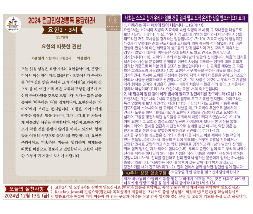 (2024년 12월 13일) 'Reading Jesus 응답하라' 말씀요약과 본문해설 (제257일차)
