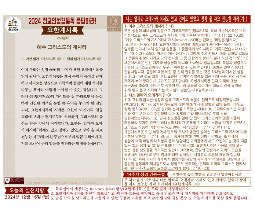 (2024년 12월 16일) 'Reading Jesus 응답하라' 말씀요약과 본문해설 (제259일차)