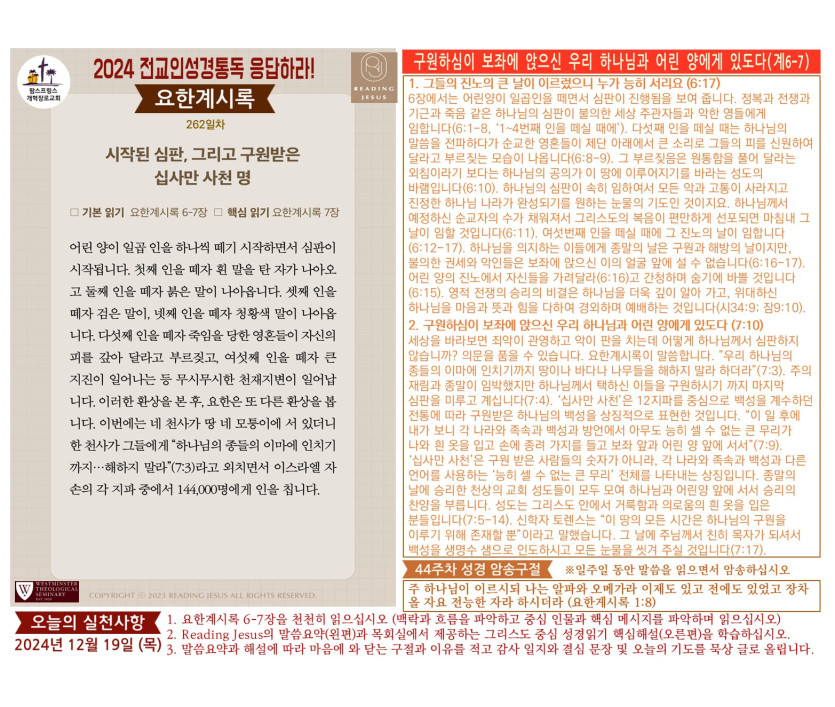 (2024년 12월 19일) 'Reading Jesus 응답하라' 말씀요약과 본문해설 (제262일차)