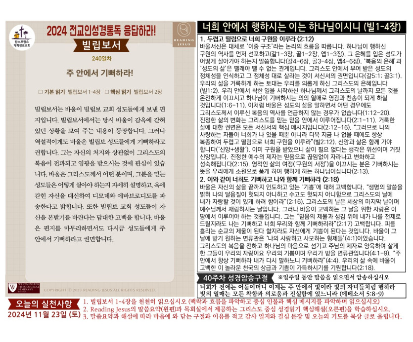 (2024년 11월 23일) 'Reading Jesus 응답하라' 말씀요약과 본문해설 (제240일차)