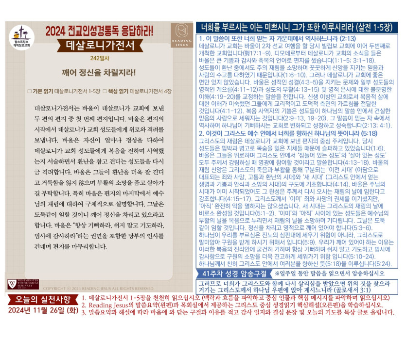 (2024년 11월 26일) 'Reading Jesus 응답하라' 말씀요약과 본문해설 (제242일차)