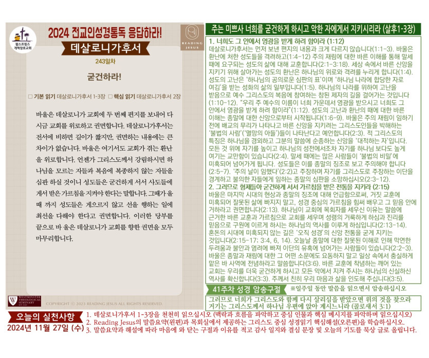 (2024년 11월 27일) 'Reading Jesus 응답하라' 말씀요약과 본문해설 (제243일차)