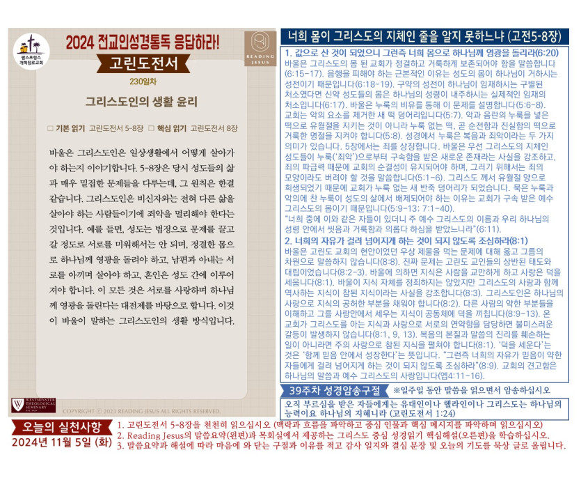 (2024년 11월 5일) 'Reading Jesus 응답하라' 말씀요약과 본문해설 (제230일차)