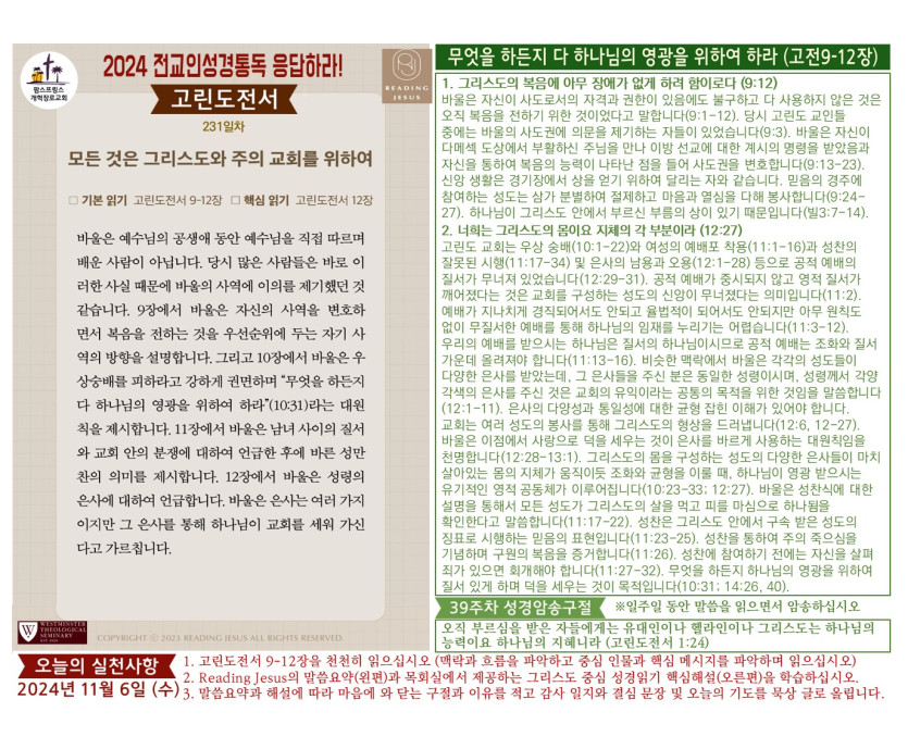 (2024년 11월 6일) 'Reading Jesus 응답하라' 말씀요약과 본문해설 (제231일차)