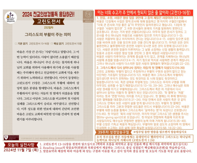 (2024년 11월 7일) 'Reading Jesus 응답하라' 말씀요약과 본문해설 (제232일차)