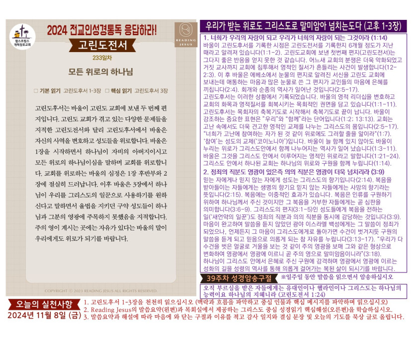 (2024년 11월 8일) 'Reading Jesus 응답하라' 말씀요약과 본문해설 (제233일차)