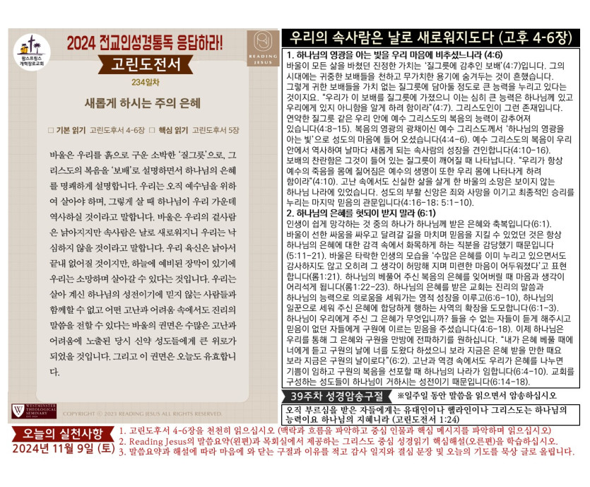 (2024년 11월 9일) 'Reading Jesus 응답하라' 말씀요약과 본문해설 (제234일차)
