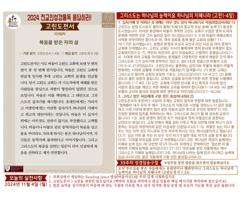 (2024년 11월 4일) 'Reading Jesus 응답하라' 말씀요약과 본문해설 (제229일차)