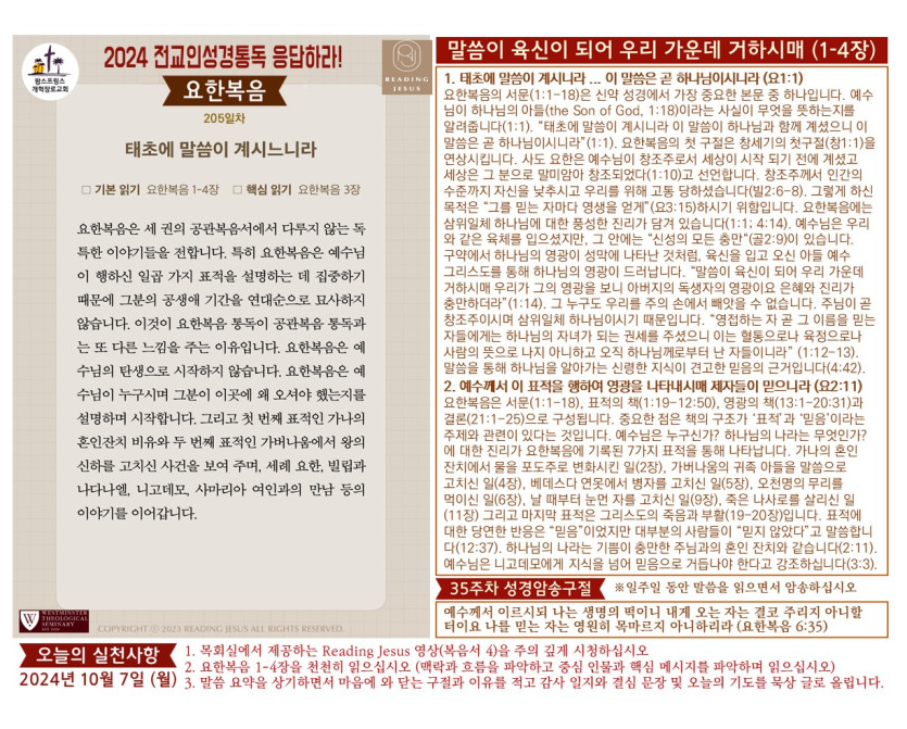 (2024년 10월 7일) 'Reading Jesus 응답하라' 말씀요약과 본문해설 (제205일차)