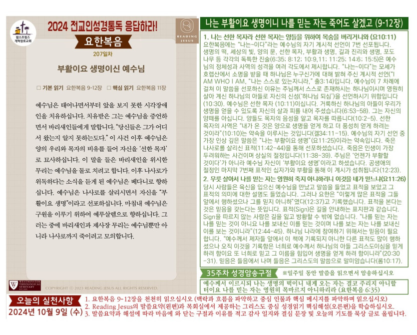 (2024년 10월 9일) 'Reading Jesus 응답하라' 말씀요약과 본문해설 (제207일차)