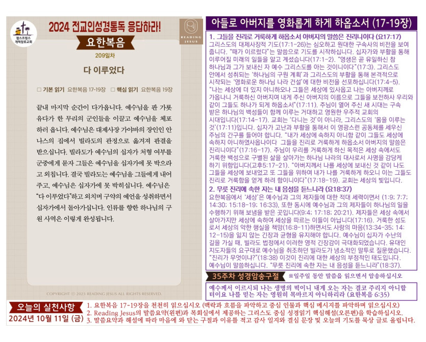 (2024년 10월 11일) 'Reading Jesus 응답하라' 말씀요약과 본문해설 (제209일차)