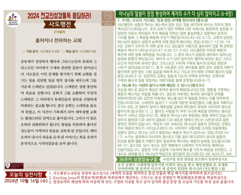 - 이전글(2024년 10월 17일) 'Reading Jesus 응답하라' 말씀요약과 본문해설 (제214일차) 24.10.17