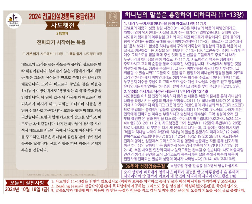 (2024년 10월 18일) 'Reading Jesus 응답하라' 말씀요약과 본문해설 (제215일차)