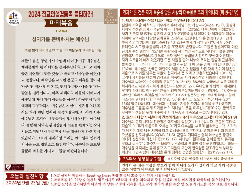 (2024년 9월 23일) 'Reading Jesus 응답하라' 말씀요약과 본문해설 (제193일차)