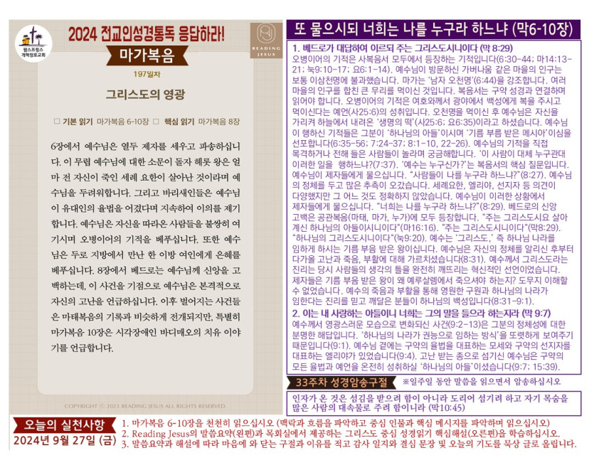 (2024년 9월 27일) 'Reading Jesus 응답하라' 말씀요약과 본문해설 (제197일차)