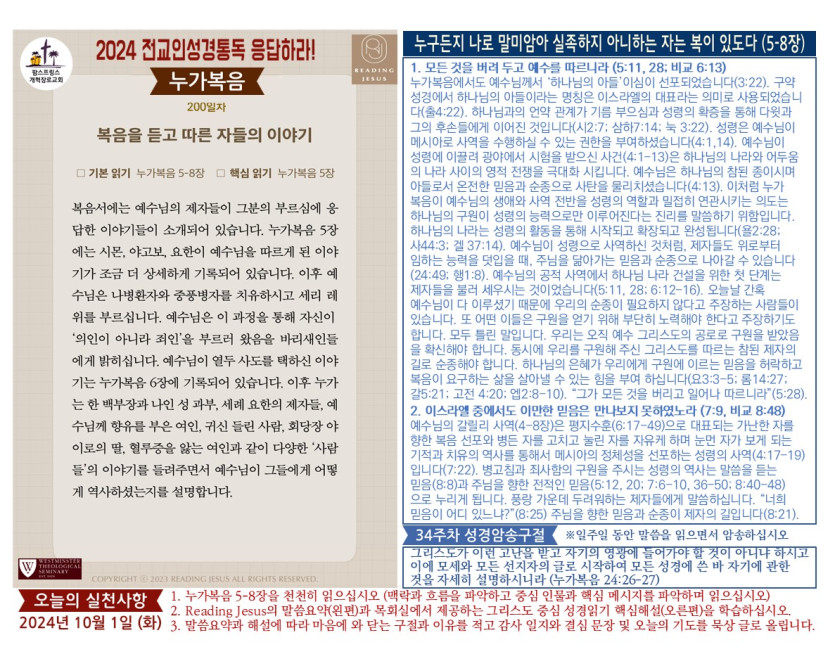 (2024년 10월 1일) 'Reading Jesus 응답하라' 말씀요약과 본문해설 (제200일차)