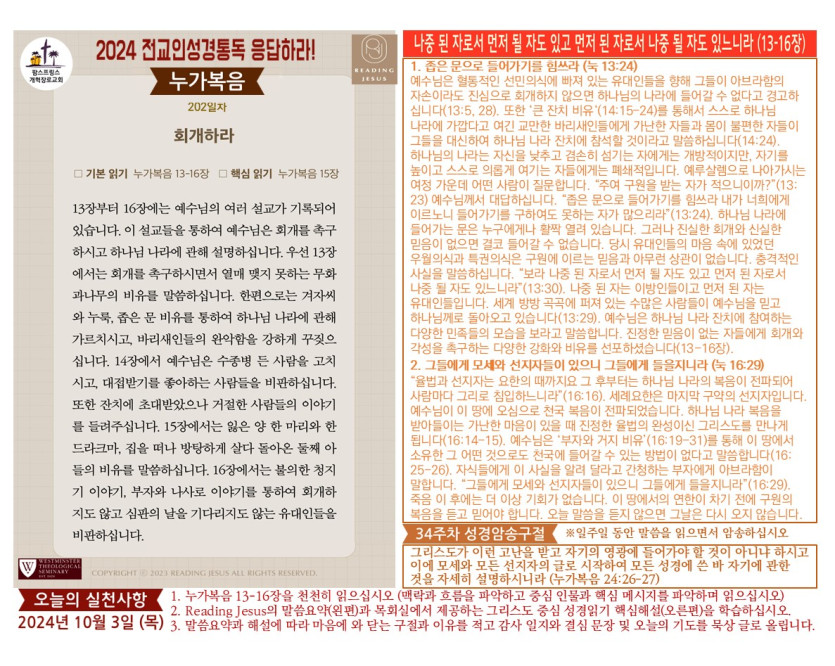 - 이전글(2024년 10월 4일) 'Reading Jesus 응답하라' 말씀요약과 본문해설 (제203일차) 24.10.05