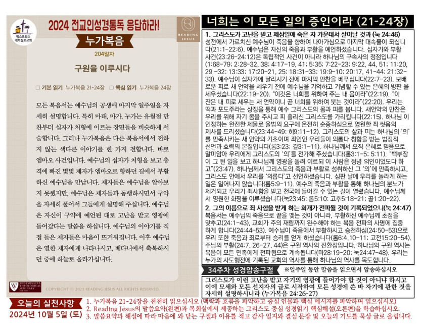 (2024년 10월 5일) 'Reading Jesus 응답하라' 말씀요약과 본문해설 (제204일차)
