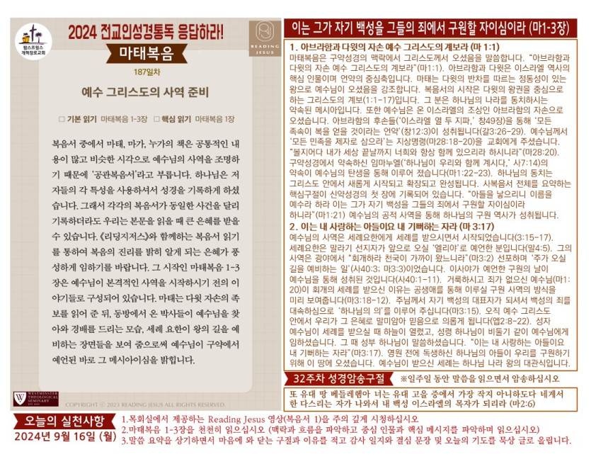 (2024년 9월 16일) 'Reading Jesus 응답하라' 말씀요약과 본문해설 (제187일차)
