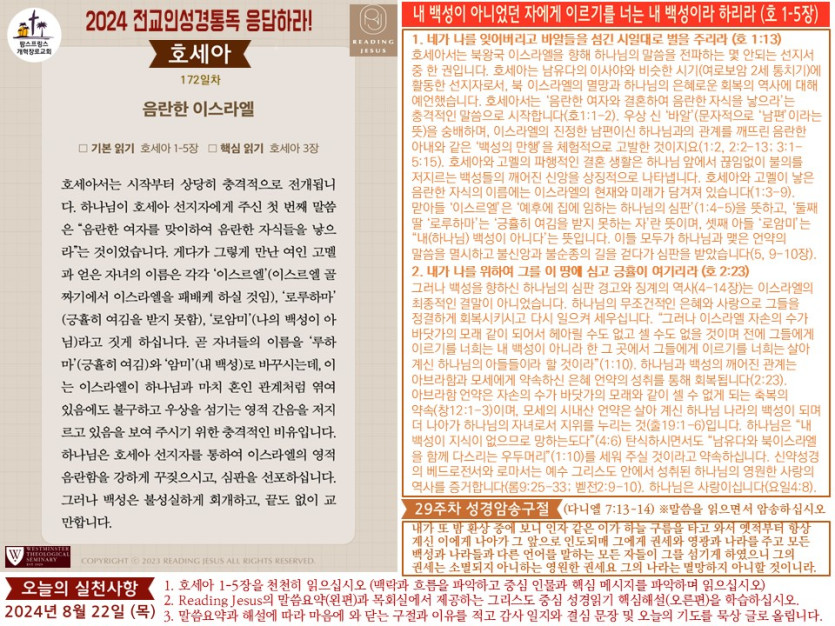- 이전글(2024년 8월 23일) 'Reading Jesus 응답하라' 말씀요약과 본문해설 (제173일차) 24.08.24