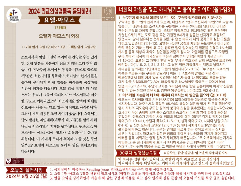 - 이전글(2024년 8월 27일) 'Reading Jesus 응답하라' 말씀요약과 본문해설 (제176일차) 24.08.27