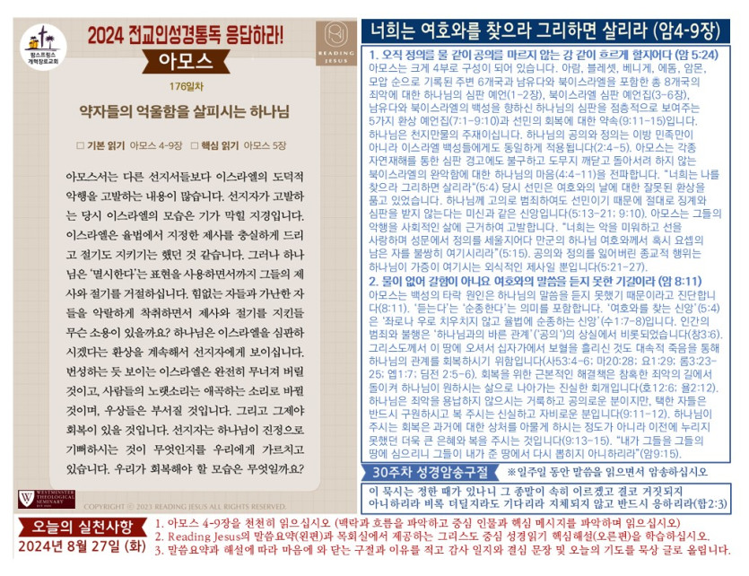 - 이전글(2024년 8월 28일) 'Reading Jesus 응답하라' 말씀요약과 본문해설 (제177일차) 24.08.28