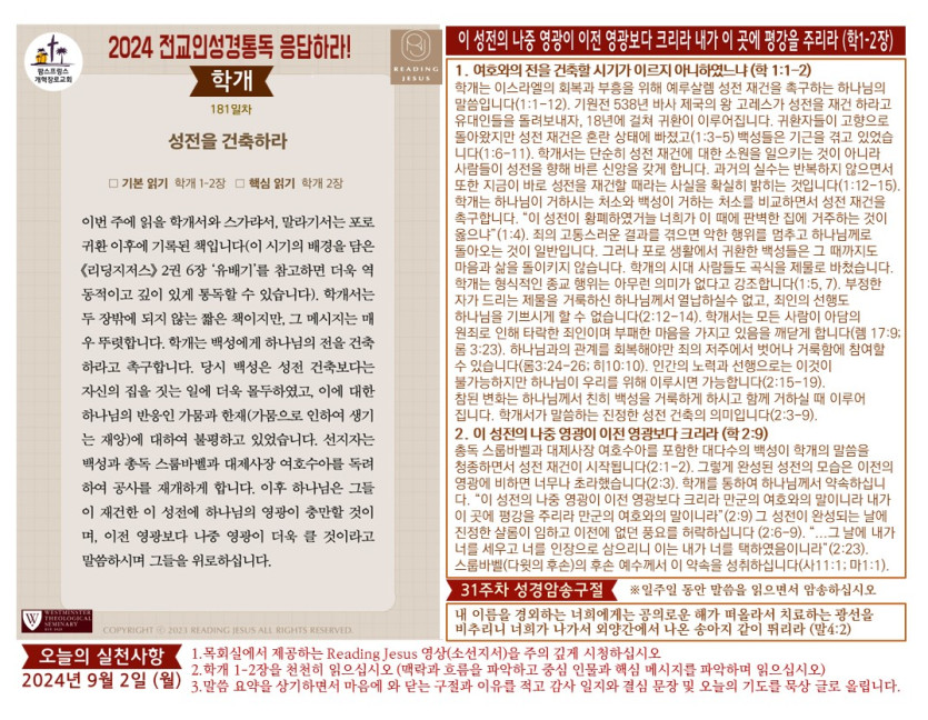 (2024년 9월 2일) 'Reading Jesus 응답하라' 말씀요약과 본문해설 (제181일차)