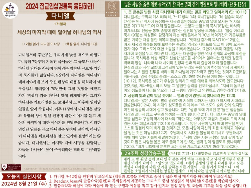(2024년 8월 21일) 'Reading Jesus 응답하라' 말씀요약과 본문해설 (제171일차)
