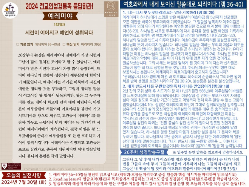 - 다음글(2024년 7월 29일) 'Reading Jesus 응답하라' 말씀요약과 본문해설 (제151일차) 24.07.29