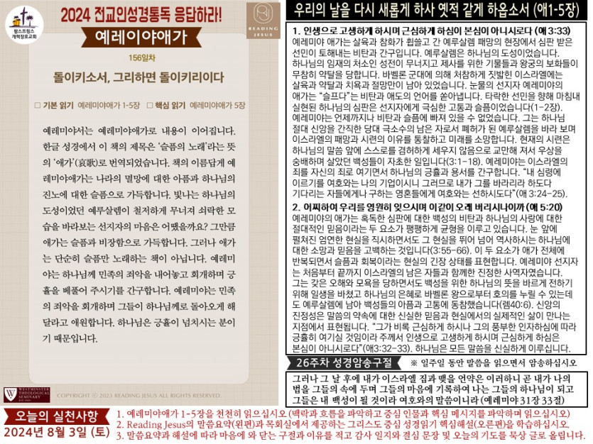 (2024년 8월 3일) 'Reading Jesus 응답하라' 말씀요약과 본문해설 (제156일차)