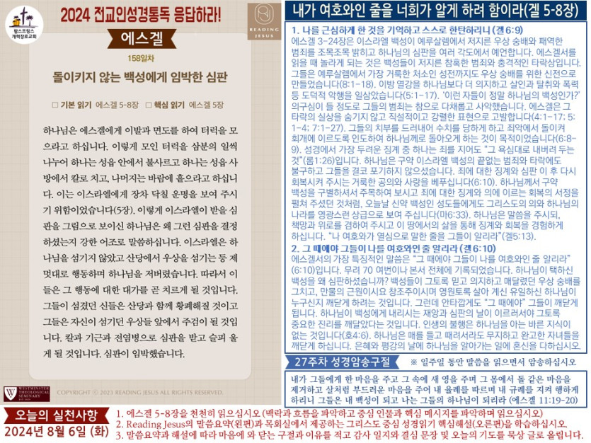 - 이전글(2024년 8월 7일) 'Reading Jesus 응답하라' 말씀요약과 본문해설 (제159일차) 24.08.07