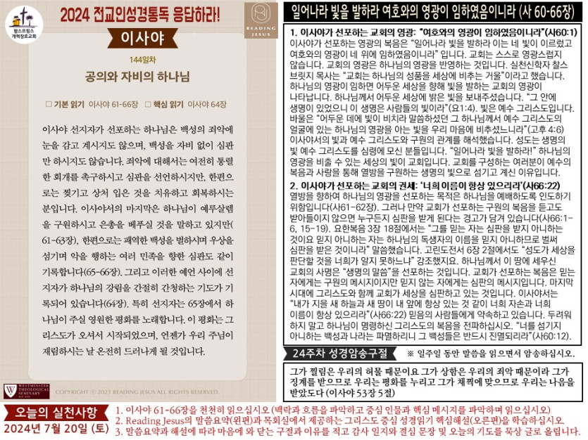 (2024년 7월 20일) 'Reading Jesus 응답하라' 말씀요약과 본문해설 (제144일차) 입니다.