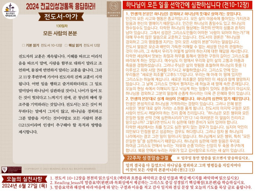 - 이전글(2024년 6월 28일) 'Reading Jesus 응답하라' 말씀요약과 본문해설 (제131일차) 24.06.29