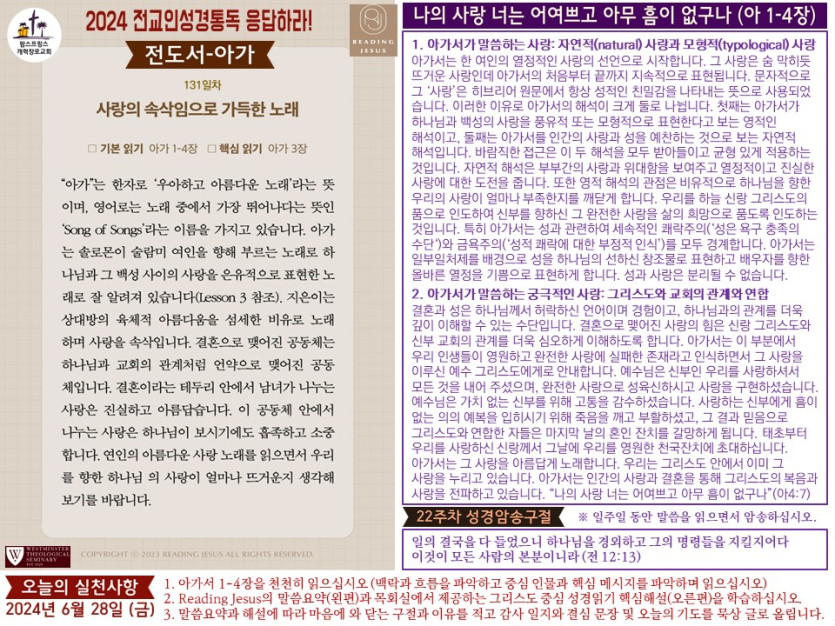 (2024년 6월 28일) 'Reading Jesus 응답하라' 말씀요약과 본문해설 (제131일차) 입니다.