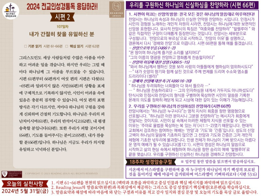 (2024년 5월 31일) 'Reading Jesus 응답하라' 말씀요약과 본문해설 (제107일차) 입니다.