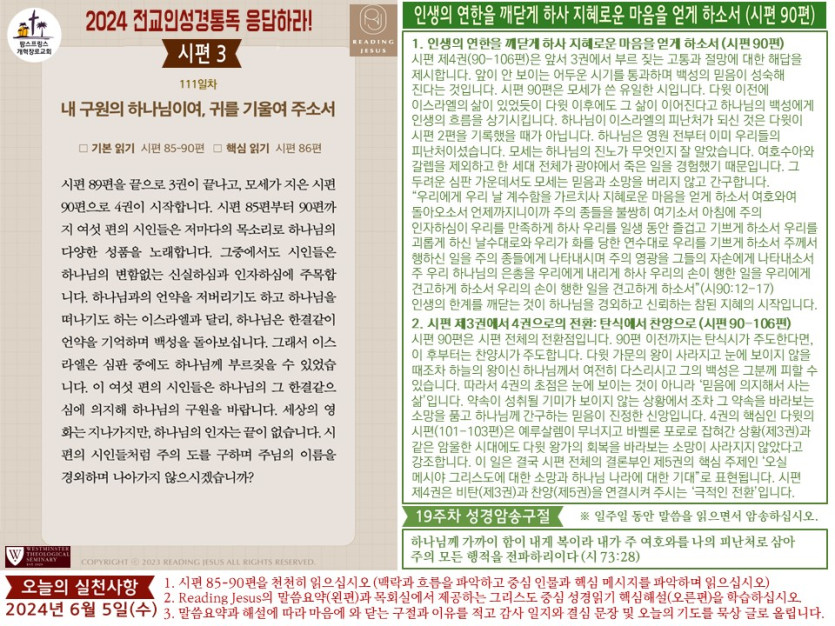 - 이전글(2024년 6월 6일) 'Reading Jesus 응답하라' 말씀요약과 본문해설 (제112일차) 24.06.06