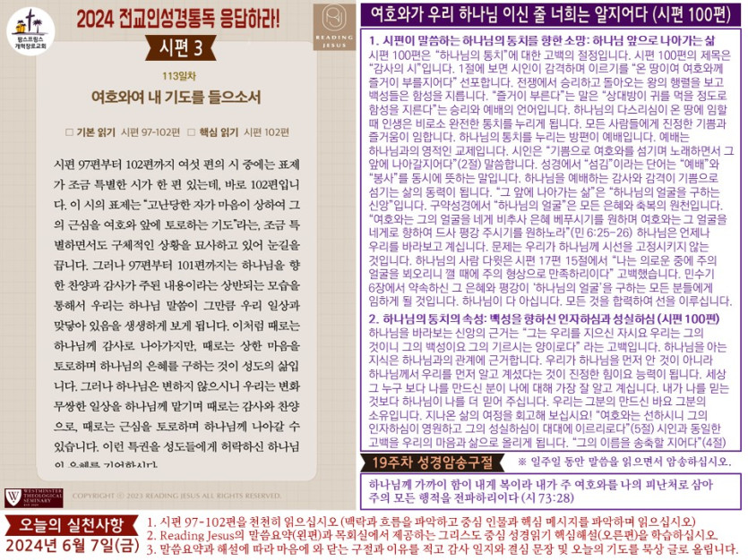 - 이전글(2024년 6월 8일) 'Reading Jesus 응답하라' 말씀요약과 본문해설 (제114일차) 24.06.08