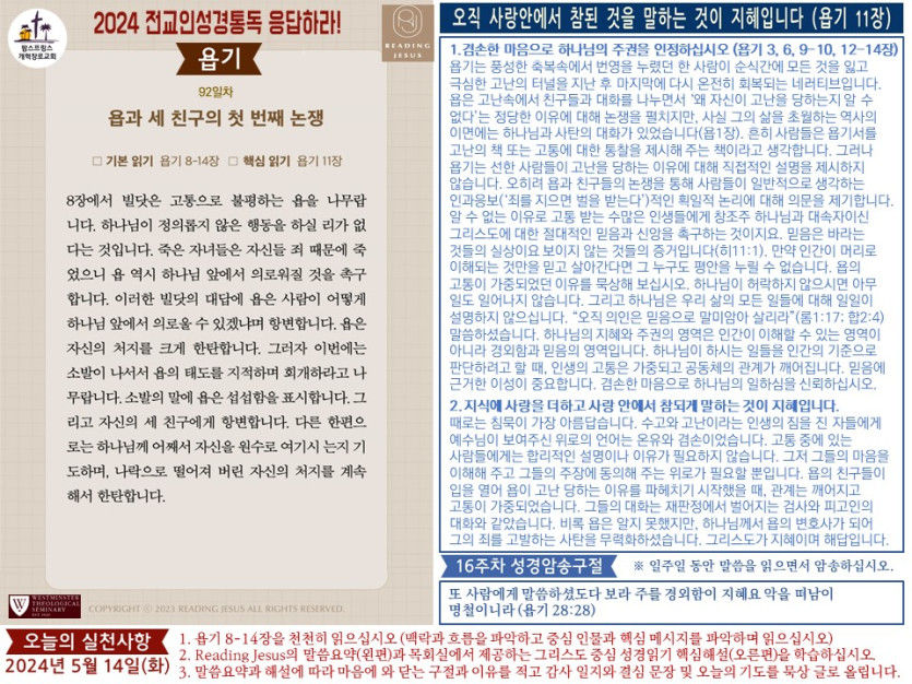 - 이전글(2024년 5월 15일) 'Reading Jesus 응답하라' 말씀요약과 본문해설 (제93일차) 24.05.18