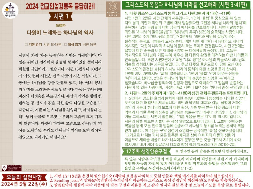 - 이전글(2024년 5월 23일) 'Reading Jesus 응답하라' 말씀요약과 본문해설 (제100일차) 24.05.24