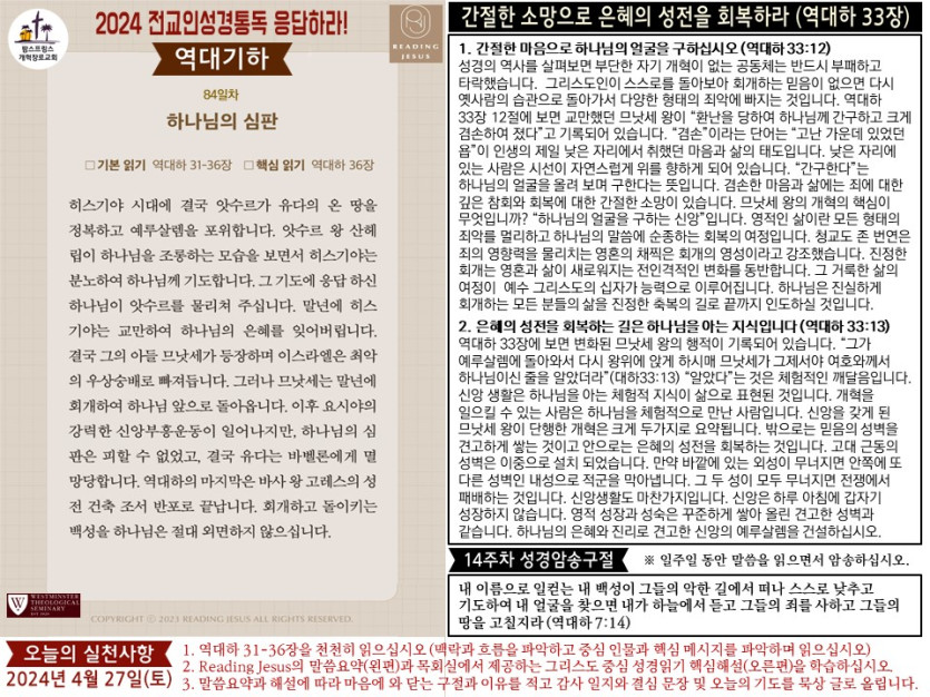 (2024년 4월 27일) 'Reading Jesus 응답하라' 말씀요약과 본문해설 (제84일차) 입니다.